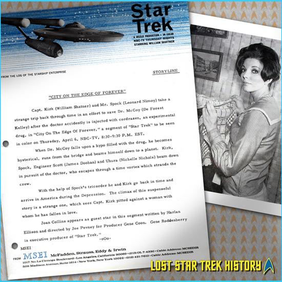 “The City on the Edge of Forever” — “City,” for short — is considered by many StarTrek fans to be the best episode of Star Trek: The Original Series and, quite possibly, the best episode of all of the Trek series (to date, anyway). That’s not surprising, since virtually every element of what makes Star Trek great can be found in “City.” It has a thought-provoking and tender story by writer Harlan Ellison, wonderful new sets by art directors Matt Jefferies and Rolland M. Brooks, terrific guest stars in Joan Collins (Edith Keeler) and John Harmon (Rodent), and outstanding acting by William Shatner, Leonard Nimoy and DeForest Kelley. Simply put, Star Trek doesn’t get much better than “The City on the Edge of Forever.”