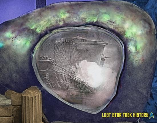 The Guardian of Forever features as the episode's main plot device. In Ellison’s original outline for the story, the Guardian was actually a group of robed aliens, nine-feet-tall, who referred to themselves as the Guardians of Forever. Eventually depicted on television via the TOS art and special effects departments, the Guardian became a large blue/gray translucent piece illuminated from within. It was circular in shape, reminiscent of a large analog clock face, and the TOS crew often referred to it as “the doughnut”. The Guardian’s time travel doorway — or time vortex as it’s referred to in the shooting script — was located within its center, and the script indicated that it should show, “A series of almost subliminal historical scenes… smoothed out or sometimes even obscured...”