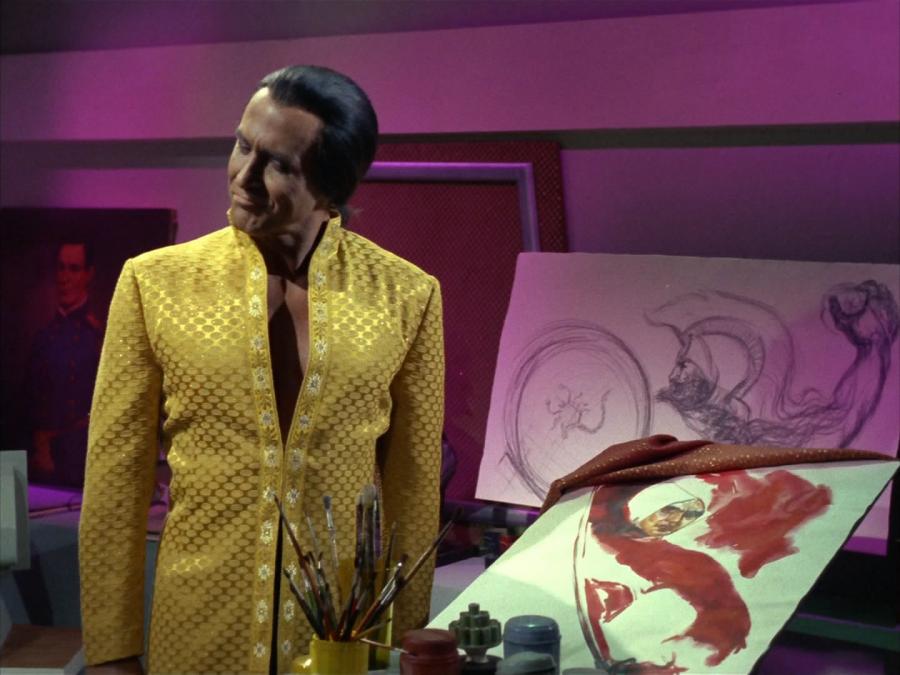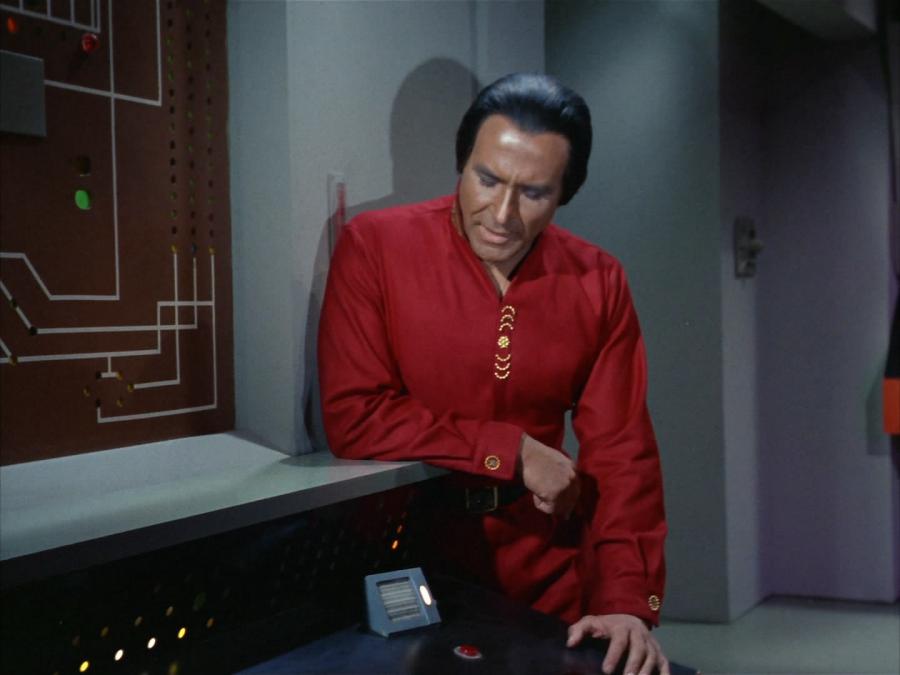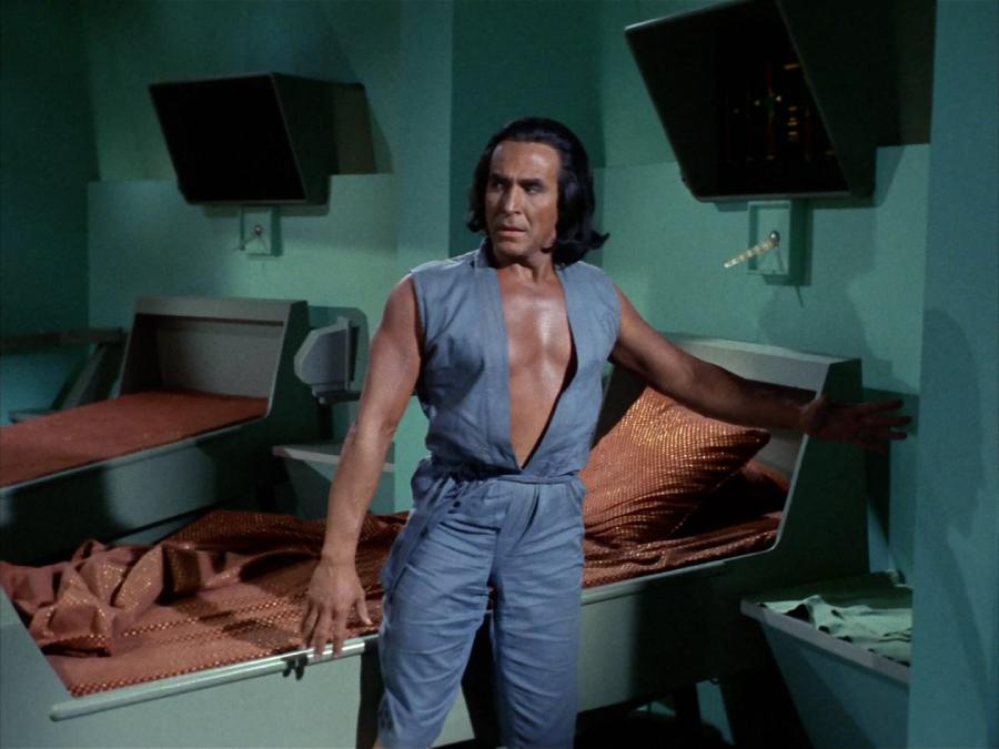 Despite these limitations, Theiss’ output on “Space Seed” is remarkable for its iconic nature and its interesting symbolism. Even with limited time, the costumes of “Space Seed” say something symbolic. Khan, for example, changes his outfit five times. Two are reuses of previously designed costumes (Gary Mitchell’s blue medical costume and an engineering costume). As an interesting aside, Khan does seem to like wearing Starfleet regalia: he does so in “Space Seed,” in The Wrath of Khan (wearing both the broken Starfleet insignia and Starfleet jacket) and in Star Trek Into Darkness (as John Harrison in the black Starfleet shirt).
