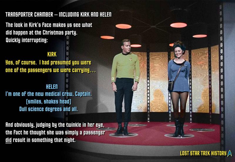 To close this article, we’ll leave you with a still from a short scene that was deleted from Act Two of “Dagger of the Mind.” The trimmed material was supposed to have occurred after Helen Noel (played by Marianna Hill) reminded Kirk that they had met previously because he had dropped in to the science lab Christmas party. In case you’re wondering, the text that accompanies this scene comes directly from the shooting script of the episode.