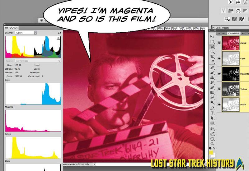 Using modern, professional film scanning equipment, a computer and appropriate software, it’s possible to digitally restore the faded film to its original color and pristine condition. The process is a bit laborious to do properly, especially when you consider that these bits of red plastic also have been accumulating dust and scratches for around 50 years. We think it’s worth it, though, because there’s no other way to view this lost TOS history. If you’re interested, you can see some examples of our restoration work at startrekhistory.com.