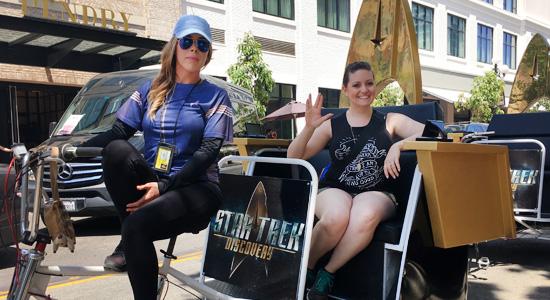 All along Fifth Avenue and the other streets in the Gaslamp District, SDCC attendees have been boldly going in style... aboard Star Trek: Discovery pedicabs. Inspired by the design of the U.S.S. Discovery’s captain’s chair, the pedicabs feature the series’ chair’s distinctive stitched black seats as well as video monitors built into its arm rests which, in this case, screen trailers for the new show. As an added touch, each pedicab displays an illuminated delta shield on the back.