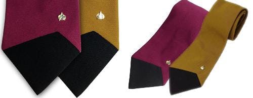 Anovos introduced a line of The Next Generation ties. Produced from a woven cotton blend, they're available in “Picard” burgundy and “Data” gold. Sold individually or in a bundled set, the ties come complete with a miniaturized magnetic communicator badge that is removable and can be taken off at your command. Available exclusively at Anovos.com.