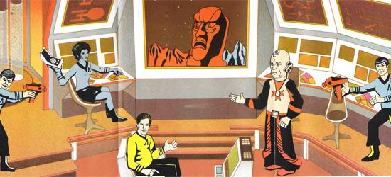 Colorforms was famous for its excellent and attractive box art, and the Star Trek Adventure Set was no exception. Inside, kids found repositionable stick-ons of Kirk, Spock, McCoy, Uhura and Dr. Sevrin from “The Way to Eden,” various other aliens, and some Trek tech. While Dr. Sevrin may be considered an odd choice when other, more-famous adversaries could have been selected, the design of the character was certainly distinctive, memorable and kid-friendly. The stick-ons themselves were mostly faithful, although Uhura’s all-blue coloring is a glaring design element flaw (it was common for Colorforms to use all one color for its stick-ons to save production costs and help keep set prices to a minimum). The U.S.S. Enterprise bridge play area tries to combine as many elements together as possible because of space limitations – including a transporter pad and Captain’s chair/helm that does not face view screen. Of course, as kids, we had fun with the Colorforms anyways, as our imaginations were inspired by the possible combinations and permutations.