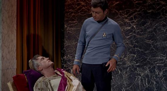 One moment I disagreed with was that Kirk was ultimately the Starfleet crewmember to display and use telekinetic abilities as a result of Bones’ fast-acting concoction. After his emotional torture, it would’ve been great to see Spock take the high road and deliver the closing speech to Parmen before they flee that dreadful planet without so much as a backward glance. Even Bones, the one being coerced into staying, would’ve made a great choice to stand up to Parmen with a display of mental force. Kirk is always at the center of the action, and since they were fighting a mental battle, I’d have liked to see the two more-intellectual members of the trio handle the final showdown. Can you imagine everything swirling around the room as an expression of Spock’s internal rage before he finally decided to spare Parmen’s life? Any moment in TOS that depicts Spock’s inner conflict is a win for Nimoy and the storytelling.