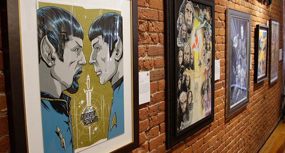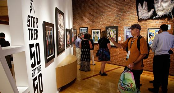 The Michael J. Wolf Fine Arts gallery in San Diego is the Comic-Con home to Star Trek: 50 Artists. 50 Years., the art exhibit created to celebrate the 50th anniversary of Star Trek. Showcasing original, Trek-inspired pieces by 50 artists from around the globe, the exhibit has drawn the attention of Trek fans and art fans both casual and professional. Even zombie killers are making their way into the exhibition, as evidenced by the unexpected, low-key visit on Friday by Andrew Lincoln, star of The Walking Dead.