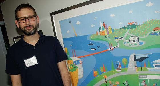 Amir Abou-Roumie, represented by the colorful, Easter egg-laden "Homestead," explained, "What I wanted to convey was the kind of positivity that Star Trek has, in my opinion, that it is represented in the colors and in the figures on it. And I also wanted to capture key moments for me, which had a kind of meaning, like the waves from Star Trek IV, and First Contact which is in the background. So that is what I wanted to get. What I also wanted to get is kind of a look behind the scenes, you know? Of a real Star Trek world. When people go to work in the morning, they travel to the Enterprise with the shuttle bus and stuff like that. So I just wanted to take an ordinary look at Star Trek. A day in the life of Star Trek."