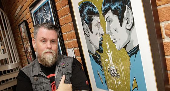 "I am a pretty big Star Trek fan, said Gary Pullin, who contributed a star Dual Spock piece called "Mirror Mirror." "I mean, I grew up on The Original Series, so I’m at that age where, when I was a kid, Star Trek was on TV, the repeats. So, TOS is what I gravitated towards when they asked me to do this piece. I just remember loving the theme song, and it had a real Twilight Zone vibe to some of the episodes, too. Some of them were kind of spooky, and I actually have a background as a horror illustrator. I’m sort of known for the horror genre, and so when they asked me to do this show, I thought, 'Oh, well this is really great.' As I say, I like to step out of the graveyard sometimes, and I am starting to do more stuff out of the horror genre. So to do something Star Trek related was a dream come true for me. "