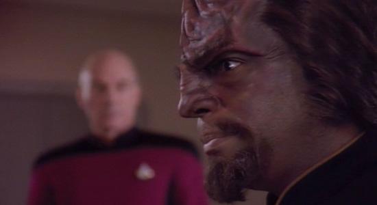 No one seemed happy with Worf in this episode. “Worf!” shouted Riker. “What the hell are you doing?" Picard was livid at the lieutenant, saying, "Mr. Worf, your personal affairs are strictly your own concern… until they interfere with the operation of this ship. You have now crossed that line." Later, Picard commented, “It’s a pity that you didn't try the holodeck instead of setting fire to your quarters."