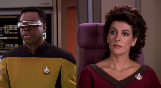 LeVar Burton and Marina Sirtis did not appear in “Rightful Heir.” According to Memory Alpha, Troi and Geordi were given lines in the script, lines that were evidently deleted. And, per production call sheets, Sirtis even shot a scene.