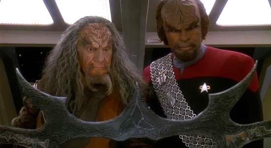 The script—inspired by Seven Samurai and The Magnificent Seven—at first did not feature the Klingons, but rather new characters. It was (writer-producer) Robert Hewitt Wolfe who suggested using Kor, Kang and Koloth.