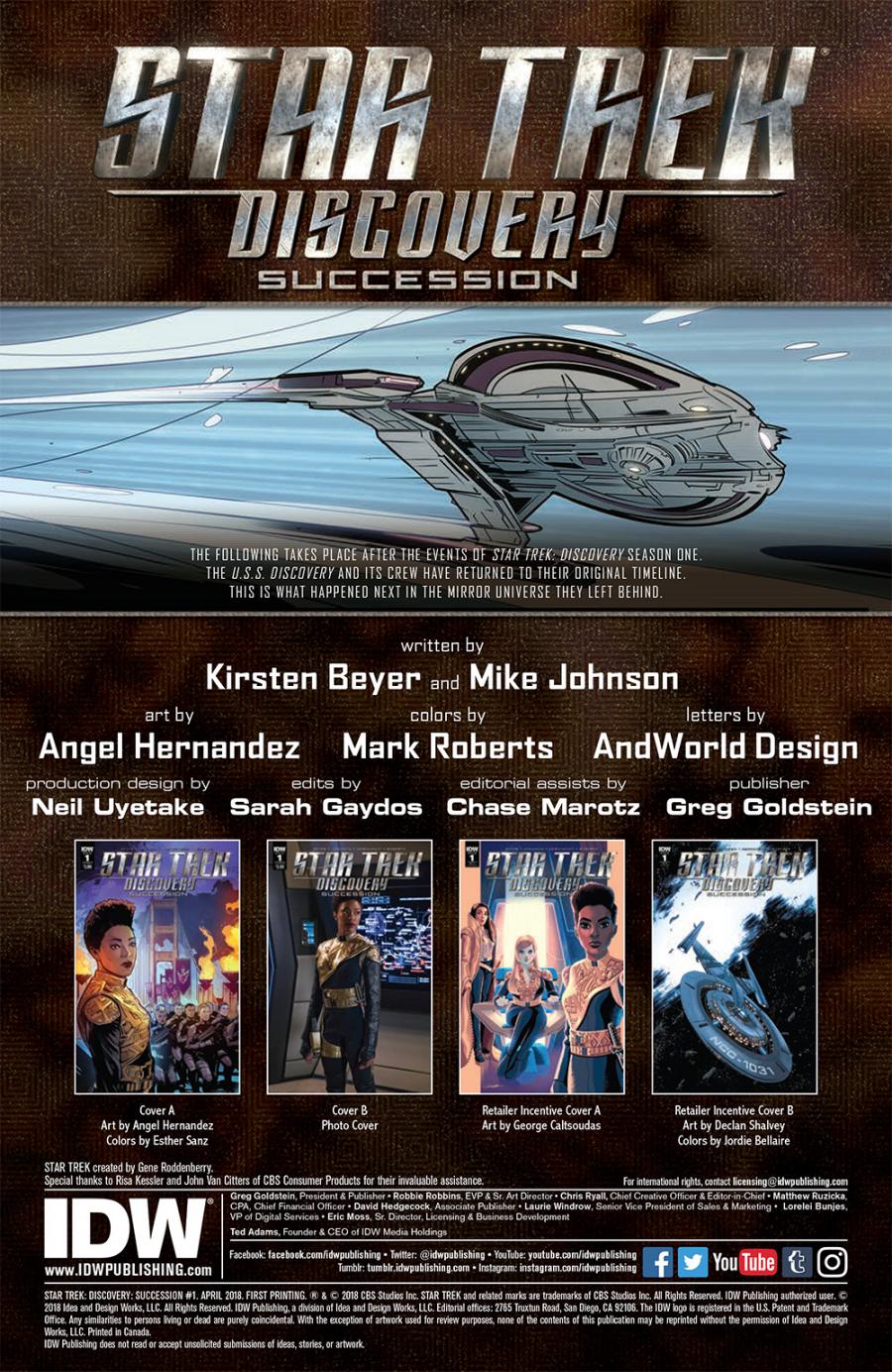 Star Trek: Discovery: Succession #1 is written by Mike Johnson and Kirsten Beyer, complemented by Angel Hernandez’s art and cover. In this, the second Discovery miniseries from IDW Publishing, your favorite characters from latest series dive into an adventure tied directly into the second half of the show’s first season.
