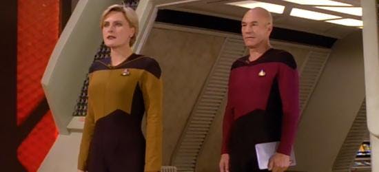 They saw three different Enterprises. Denise Crosby, Colm Meaney and John de Lancie returned one last time as Tasha Yar, Miles O’Brien and Q, respectively.