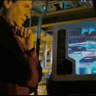 Out comes J.J. from around some pipes at the other end, wearing a heavy jacket and a hat with flaps. He wiggles a little wave toward me at the end of the line, to which I look around to make sure it’s me he’s maybe waving at. So I wave back, and he turns and walks away. Weird. Then he’s back doing the underhand kung fu finger wiggle, which says “Come on.” So I look around again, and then start following. He walks up to the monitor that has Chekov frozen on it, and stands there and stares at it for an indeterminate time. Then he breaks and says, “Can you do that?” I say “of course” and take up the pose. He goes away, then brings back another person in red to stand in front of the camera that was behind us on a track. And then, we shoot the shot that shows up in the middle of Chekov’s “anomaly in space” speech. I did do a bunch of scenes shot in the main engineering area, which was where Bones brings Kirk aboard, but only a couple of “blinks” are there, and a long special effects shot that had me ordering around other Engineers didn’t make it.