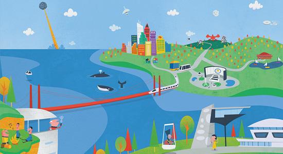 What I wanted to convey is the positivity that Star Trek has, in my opinion. Every time I thought about it, I thought about the colors and about the figures in it, and I also wanted to capture key moments for me which had a meaning, like the waves from Star Trek IVand the first contact in the background. That's what I wanted to get, and what I also wanted to get is a look behind the scenes of the real Star Trek world. So, when the people go work in the morning, they're driving to the Enterprise on the shuttle bus and stuff like that. I just wanted to take an ordinary look at Star Trek.