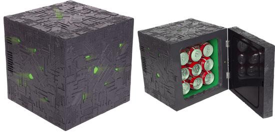 Well, this is unusual, unique and inventive: a Borg Premium Mini Fridge/Cooler. New from Robe Factory and available now via ThinkGeek.com, it's a fridge/cooler shaped like a Borg Cube. Just plug it in, and the detailed replica Borg Cube automatically will glow green on the inside when the door is opened. It will also glow green on the outside at the flick of a switch. The product measures 11.5" cubed on the outside and holds up to nine 12-oz. cans.
