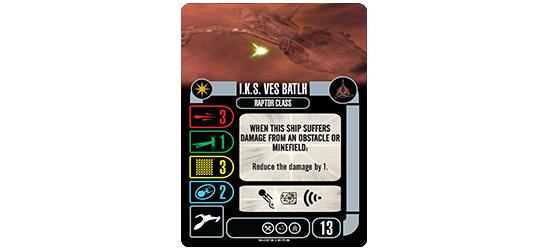The next ship to be previewed is the I.K.S. Ves Batlh, a Raptor Class ship last seen in Wave 3 of the original expansion packs. Compared to the I.K.S. Somraw at 20 SP, the I.K.S. Ves Batlh is a lean 13 SP for the same ship stats, action bar, and upgrade bar. Even the generic version of the ship is reduced from 16 SP to 11 SP. The special ability for this ship, however, is what truly sets it apart from its predecessor. The I.K.S. Ves Batlh reduces the damage from mines by 1. That means the I.K.S. Batlh can fly into a mine field with little or no fear, knowing that it can use its Scan Action to reduce a cloaked mines attack from 3 dice to 2 and then use its special ability to further reduce any damage that might be taken by the mine. This valuable ability will make the I.K.S. Ves Batlh a mighty addition to any Klingon Swarm Fleet.
