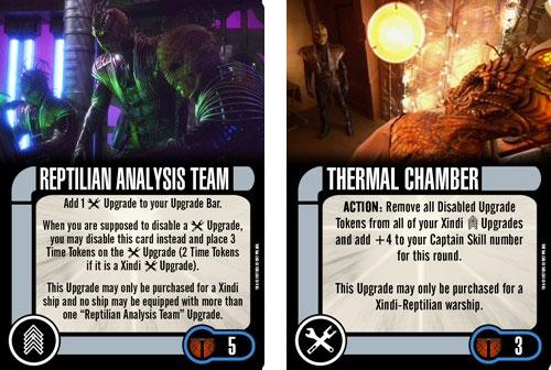 Reptilian Analysis Team is the only Crew Upgrade in this Expansion Pack. Add 1 Tech Upgrade to your Upgrade Bar. When you are supposed to disable a Tech Upgrade, you may disable this card instead and place 3 Time Tokens on the Tech Upgrade (2 Time Tokens if it is a Xindi Upgrade). The Xindi are going to protect their sensitive technology from enemy hands; you might be able to slow them down, but with this upgrade they won’t be out for long.