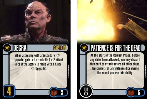The Xindi-Reptilians are the kind of opponents who will shoot first and ask questions later. This trait is demonstrated by the Elite Talent, Patience is for the Dead. At the start of the Combat Phase, before any ships have attacked, you may discard this card to attack before all other ships. You cannot roll any defense dice during the round that you use this ability. Although it comes at a price (not being able to roll defense dice), being able to attack before any other ship is an amazing ability that can cripple an opponent before they have a chance to react.