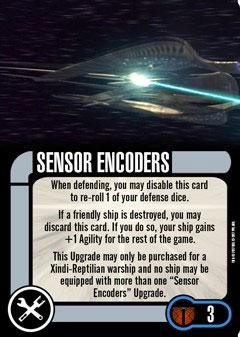 The last Tech Upgrade in this Expansion Pack turns to the defensive side of battle. Sensor Encoders allows you to disable this card to re-roll 1 of your defensive dice. More importantly, however, if a friendly ship is destroyed, you may discard this card. If you do so, your ship gains +1 Agility for the rest of the game.