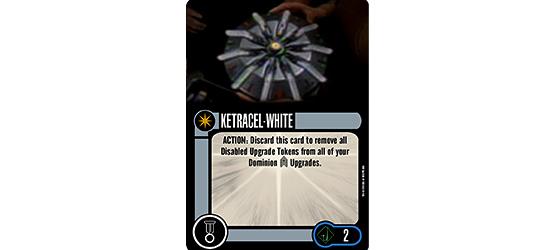 The Jem’Hadar are powerful soldiers, fueled by a strong narcotic called Ketracel-White. In order to represent the unrelenting will of the Jem’Hadar, this card may be discarded to remove all Disabled Upgrade Tokens from your Dominion Crew Upgrades. The Jem’Hadar will stop at nothing until the mission is complete. As long as Ketracel-White is around, they will never be disabled and victory is close at hand.