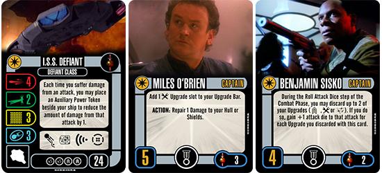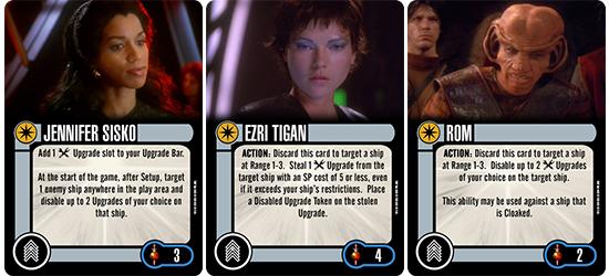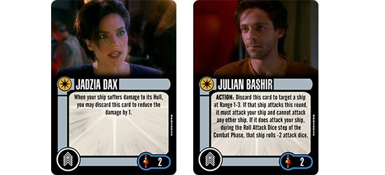 Ezri Tigan makes her debut with the ability to steal Tech upgrades from other ships, while Jennifer Sisko adds a Tech slot to your ship and starts your opponent off at a disadvantage by disabling up to 2 upgrades on 1 enemy ship. Additionally, Rom can be used to disable two Tech upgrades on an opposing ship later in the game. Julian Bashir forces the opponent to attack his ship and roll fewer attack dice while doing so. Finally, Jadzia Dax can be discarded to reduce the damage inflicted upon her ship.