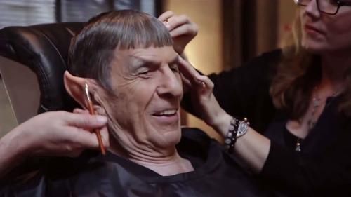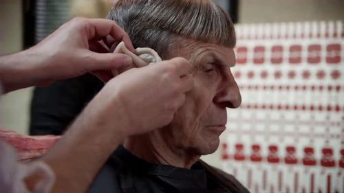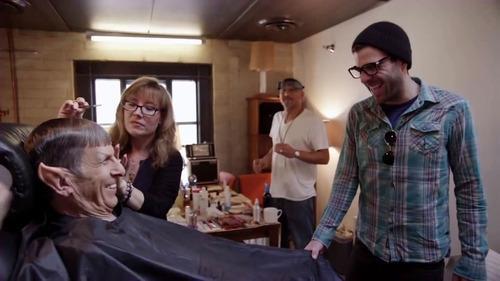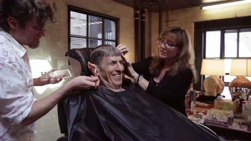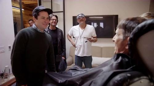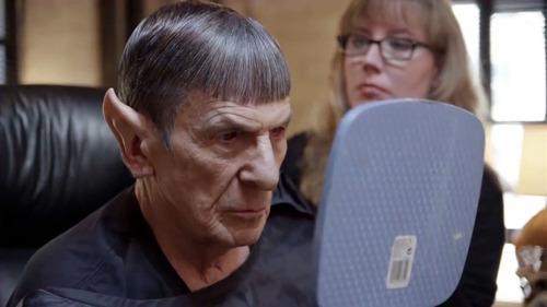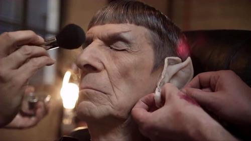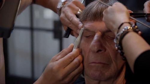 Star Trek Into Darkness premiered on this day in 2013. It, of course, featured what turned out to be Leonard Nimoy's final appearance as Spock before his death in February, 2015. To commemorate the second anniversary of STID's release, we thought we'd share screen grabs from a Nimoy/Spock-centric bonus feature on the Star Trek Into Darkness Blu-ray... images of Nimoy in makeup chair at Bad Robot, getting his eyebrows done and his Spock ears applied, then checking out his Spock-ified self in a mirror, and also chatting with Zachary Quinto and J.J. Abrams.