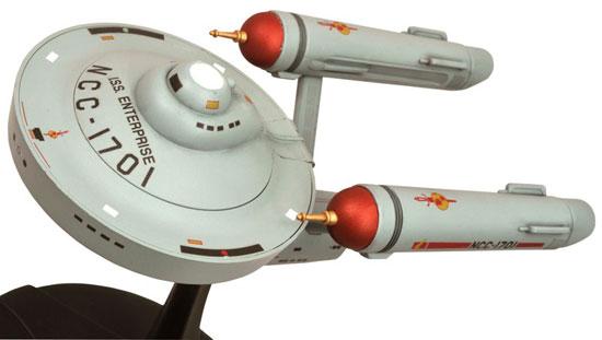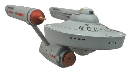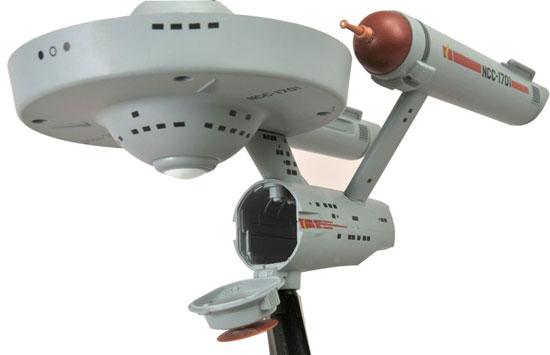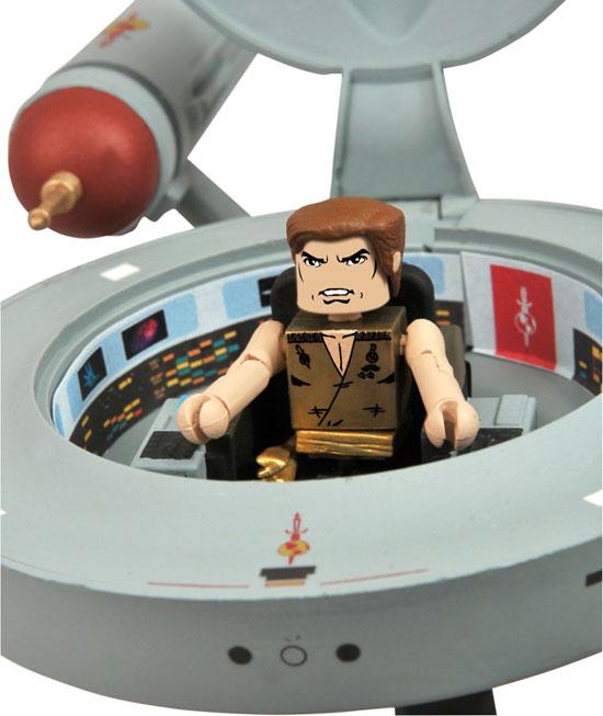 Well, that resembles the Enterprise, but with a twist. And that looks like Kirk, but, man, he seems angry. Look closer, folks. It’s the I.S.S. Enterprise and the Mirror Universe Kirk as seen in the TOS episode “Mirror, Mirror” – designed by Art Asylum and given the Star Trek Minimates treatment. A Diamond Select and Entertainment Earth exclusive from Minimates, the I.S.S. Enterprise, which will be available in May, features distinctive Terran markings, an engineering section that opens up to reveal a hidden Jefferies Tube and a bridge that opens up to reveal a removable captain’s chair. An exclusive Captain Kirk Minimates Mini-Figure – complete with scowling face and in a sleeveless gold tunic – is included, as is an adjustable display base.