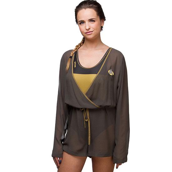 youini Swimwear line. First up are one-piece swimsuits that come in blue, gold or red and are modeled after the TNG uniform. Each suit includes a back hook closure with two adjustment options for custom fit, removable soft bust cups for shape and an embroidered, stiched-on combadge. Available in sizes S to 2X, the suits cost $59.99 apiece. Go HERE to purchase.Next, there's the Deanna Troi Swim Shirt, a long-sleeved shirt that's ideal for covering up from the sun and for use as a rash guard by surfers and bodyboarders. The lavender swim shirt is based on the jumpsuit Troi wore in seasons two and three of TNG, and it features a stiched-on embroidered combadge. Available in sizes S to 2X, it sells for $49.99. Go HERE to purchase. And lastly, there's a TNG Cover-Up Romper, perfect for layering or throwing over your suit. It's a one-piece grey, gauzy cover-up with a gold drawstring waist and piping, as well as an embroidered combadge. Available in sizes S to 3X, it costs $39.99. Go HERE to purchse. All of the products are in stock now.