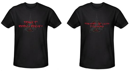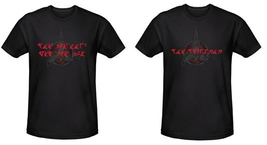 Klingon fan, are you? Well, the Star Trek Shop offers a new quartet of black t-shirts featuring Klingon sayings (in Klingon, of course), over a Klingon logo. All the shirts cost $24.95 and come in sizes small to XXL. Go HERE for "Honor Is More Important Than Life," HERE for "May You Die Well," HERE for "Stop Talking, Drink," and HERE for "To Really Succeed, You Must Enjoy Eating Poison."