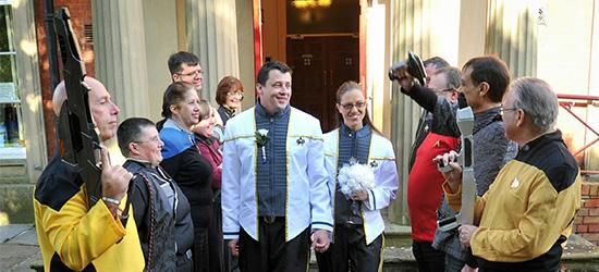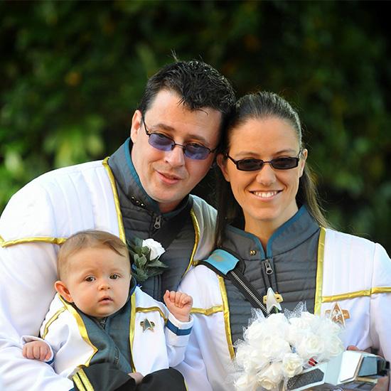 Kim Henderson and Gordon Florence, a couple who hail from Breightmet in England, got hitched on Saturday... and they did so in unforgettable Star Trek fashion. They sported The Next Generation/Insurrection-style ceremonial white uniforms, while their guests wore a variety of Trek costumes and flashed the Vulcan greeting. Even the newlyweds' 7-month-old baby Jadzia -- yes, Jadzia, named after you know who -- donned matching ceremonial whites.
