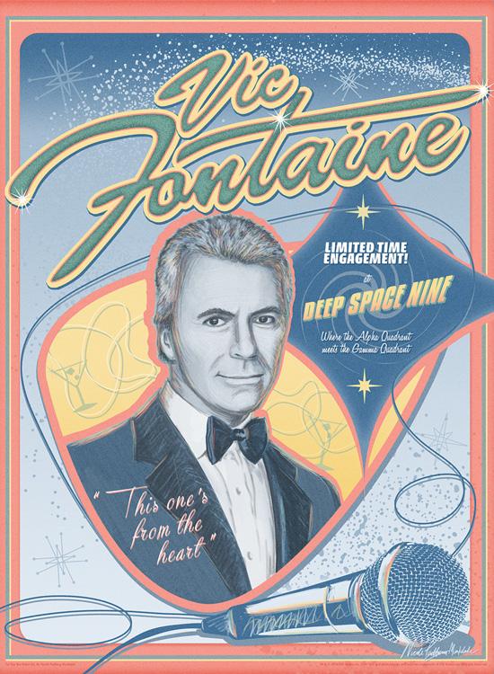 The DS9 print is by a new Bye Bye, Robot artist named Nicole Padberg Munkdale, who also happened to act at Star Trek: The Experience in Las Vegas. Her DS9 piece pays tribute to classic Vegas-style concert marquee posters from the 1960s, but with Vic Fontaine direct from Quark’s Bar. Entitled “From the Heart,” it measures 18”x24” on heavyweight acid-free card stock and presents colors and imagery from Vic’s club.