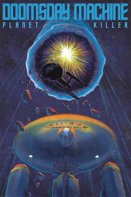 Returning artist Mark Brayer has created the second entry, and it’s done in the same style as his ship series for Bye Bye, Robot. “The Doomsday Machine” boasts a design featuring the U.S.S. Enterprise and U.S.S. Constellation along with key elements from the TOS episode of the same name. Brayer’s signature retro book cover-style accents the color and text of his design. Comprised of subtle shades of blue and bright highlights of orange, this visually striking poster is 16”x24” and comes printed on heavyweight acid-free card stock.