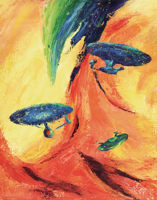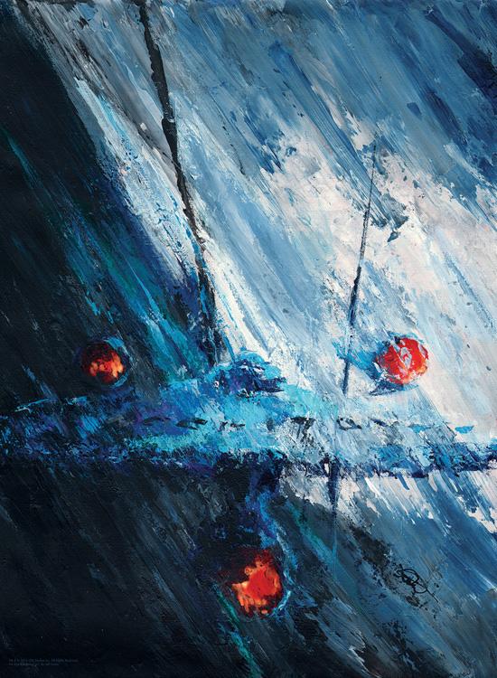 Another returning artist, Jeff Foster, offers a pair of new images to collectors for this release. The first piece brings us a view of the classic NCC-1701 in shades of blue, red, orange and white. Thick, angular paint strokes are highlighted by opposing accent lines and the bold front facing view of the ship. Entitled “Blue Enterprise” and sized at 18”x24,” this head-on sight stares viewers right in the eye and shows the strength of its subject.
