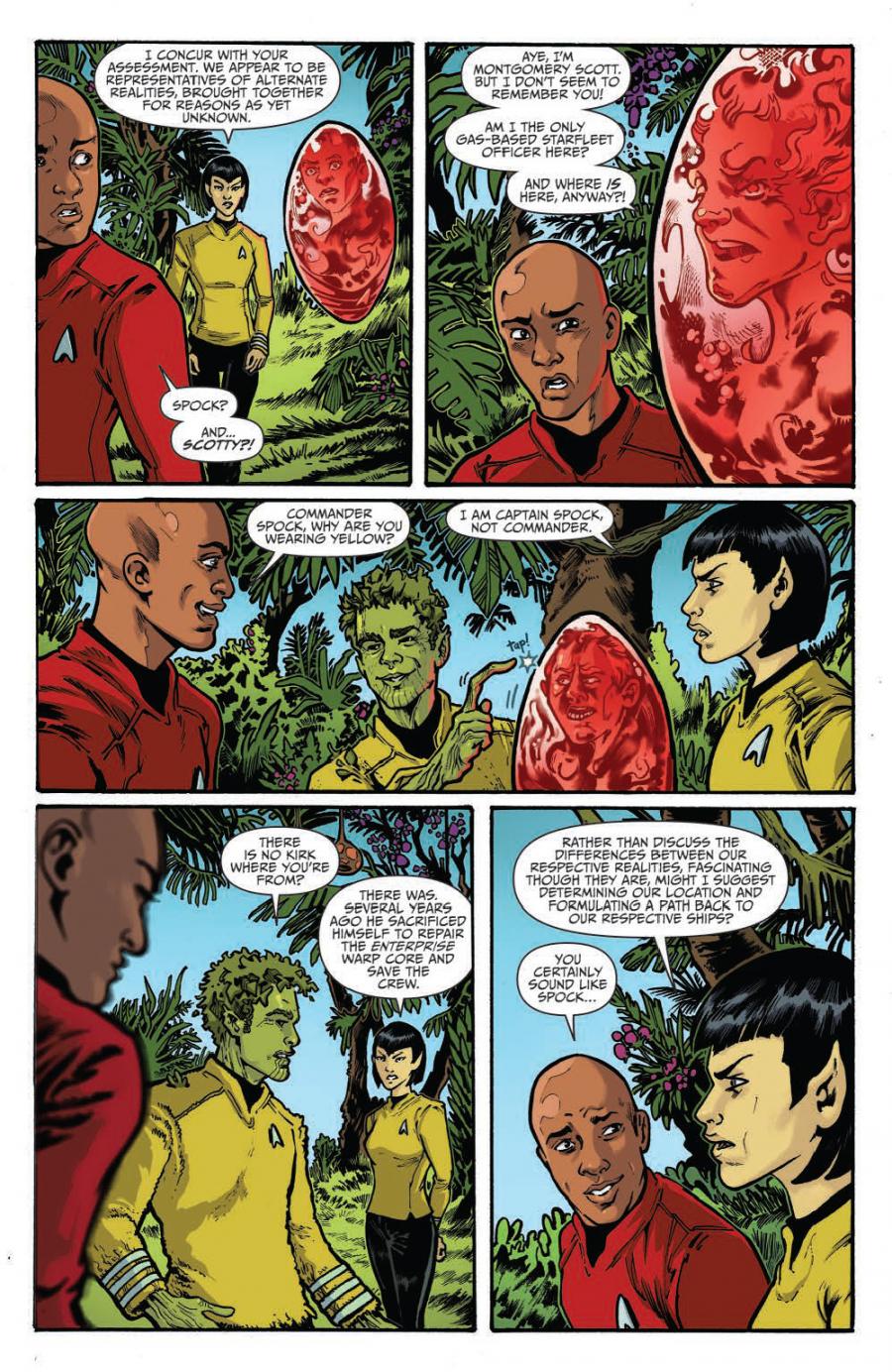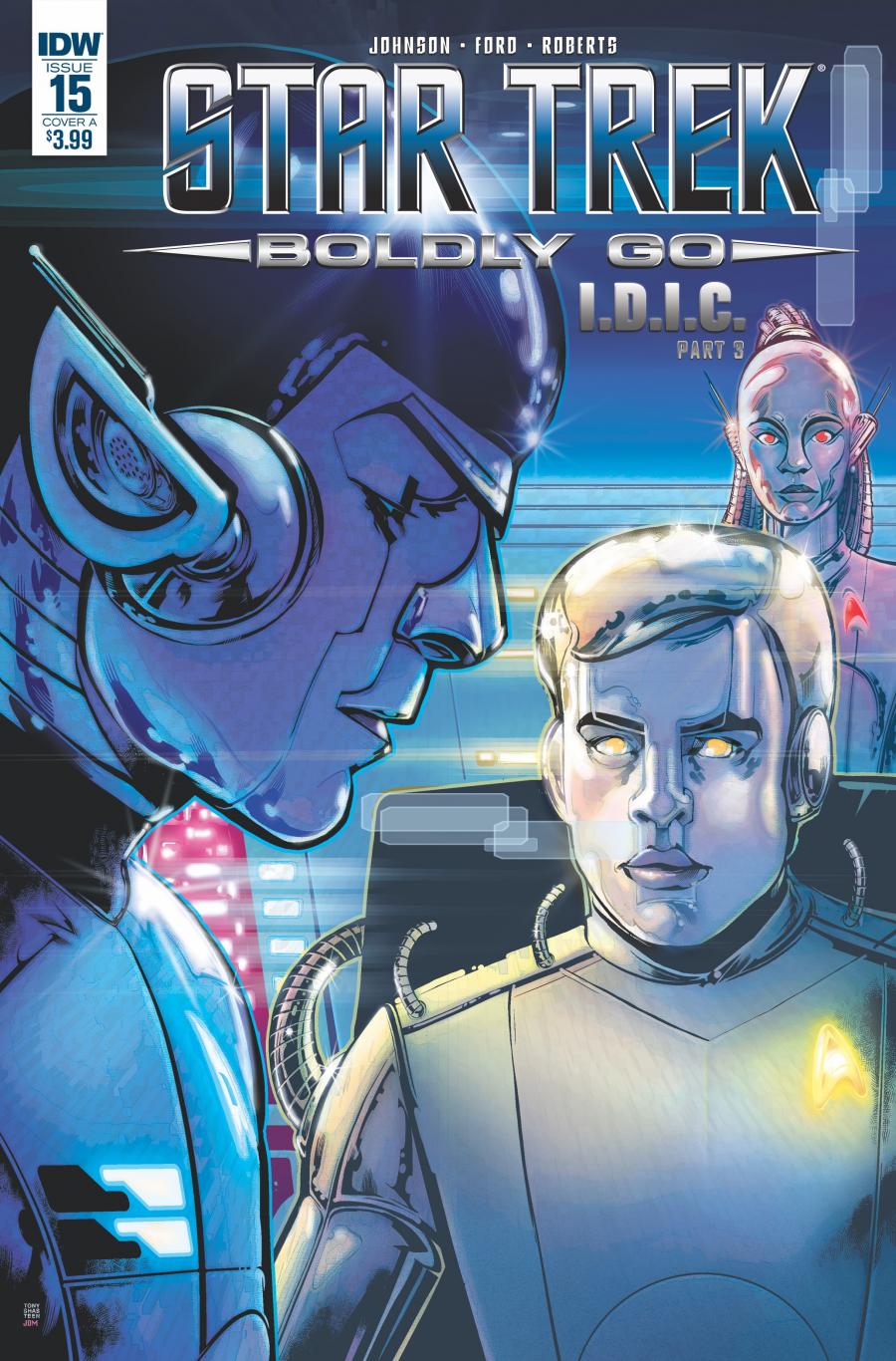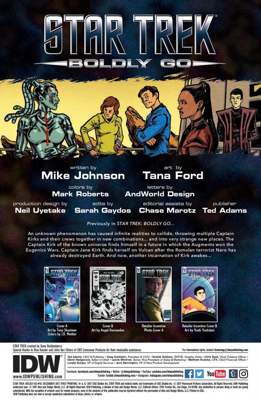 IDW Publishing’s six-part comic-book adventure Star Trek: Boldly Go will continue on Wednesday with the release of the 15th installment, “I.D.I.C., Part 3 (of 6).” Written by Mike Johnson with art by Tana Ford and a Tony Shasteen cover, the story reveals the mastermind behind the colliding realities and asks the following question: Can the multiple Kirks and their crews unite in time to save all of their universes?