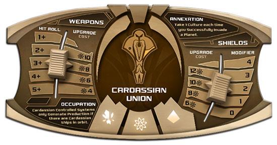 The Cardassian Union is driven by the hunger for resources and territory. Special Rules for the Cardassian player reflect their oppressive society. During the game, a Cardassian players earns bonus Culture Tokens whenever they successfully conqueror another world via Planetary Invasion. Cardassia harvests precious resources through forced labor, so there must always be a military presence on the worlds they control in order to collect Production Tokens.