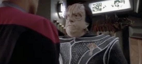 SCHUCK: We had this outdoor set that looked very realistic. Tony Amendola was great. I do remember the makeup because it was so different from the Klingon look or the Cardassian look that I had that I had a hard time. I didn’t think I had the right hook on that character and that was because my look didn’t match my perception of myself. I felt out of place. I was not a big fan of the episode. The idea was interesting: classic Greek or Roman theater, a chorus. Associating it with that style of drama was a very clever idea, but I remember being a little disappointed.