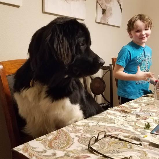 Brian Erin Proosow -- This is Riker, our 9-month-old newfoundland, sitting at the table playing the Game of Life, Pirates of the Caribbean edition. Big dogs play to win.