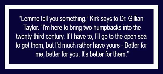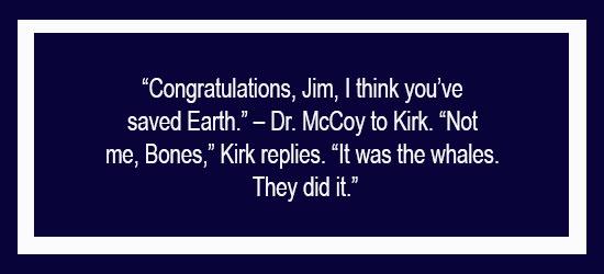 It's Earth Day once again. And to celebrate, StarTrek.com takes a loving look back at the most pro-environmental Star Trek film of them all: Star Trek IV: The Voyage Home. The plot came down to this: save the whales, save the world. Man, in the future, had long ago driven humpback whales to extinction and now, ironically, it would take the lyrical whale calls of George and Grace in 1986 to save the future. So, with some sci-fi magic—the slingshot effect (a/k/a light-speed breakaway factor) -- Kirk, Spock and the Enterprise crew landed in San Francisco and engaged in an entertaining, often funny, thought-provoking trek into our (then-) contemporary world.Director-star Leonard Nimoy revealed in his commentary on the Star Trek IV DVD that, early on, the idea was floated of the Enterprise crew seeking... an extinct plant. Fascinating, sure, but not particularly dramatic. However, whales provided genuine heft (literally and figuratively), not to mention beauty and mystery.