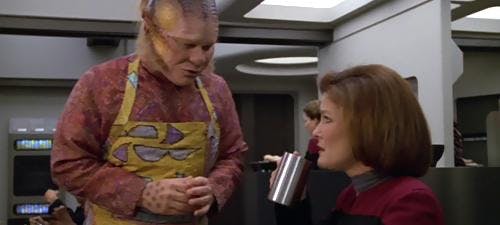 How amusing is it when Janeway practically threatens Neelix to fetch her coffee, and not just coffee, but coffee black? And, when she sips it, her reaction is priceless.