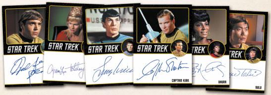Also included are all-new autograph designs for Bridge Crew actors (including William Shatner, Leonard Nimoy, Nichelle Nichols, George Takei, Walter Koenig and Grace Lee Whitney), as well as such guest stars as Roger Perry, Yvonne Craig, Lee Duncan and Michael Barrier. Bonus sets/cards include Bridge Crew Portraits, Star Trek: The Animated Series poster art by Juan Ortiz, Enterprise and Romulan Warbird Portrait Cards, a "Ships of Star Trek" Painted Art Card by Charles Hall, and more.
