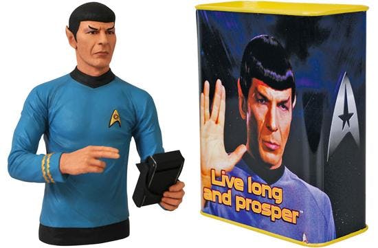 Diamond Select Toys will be releasing a Star Trek Original Series Spock Bust Bank in the United States. Alternatively, U.K. fans are treated to a money box tin picturing Spock with the words “Live Long and Prosper” from Half Moon Bay. Star Trek banks make it fun and easy to save pennies for those proverbial rainy days and to prosper.