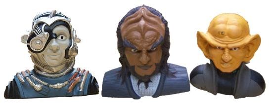 Some of the first Star Trek themed banks were produced in 1975 by Play Pal, Inc. These 11” high plastic banks had two versions: Kirk or Spock. However, it was during the 1990s that the heyday of Trek banks occurred when Thinkway Toys had the Trek bank license. During 1993-1994, the company produced three character banks of a Klingon, Borg, and, appropriately, a Ferengi. These were nicely detailed in plastic and served double duty as both a bank and a collectible bust.