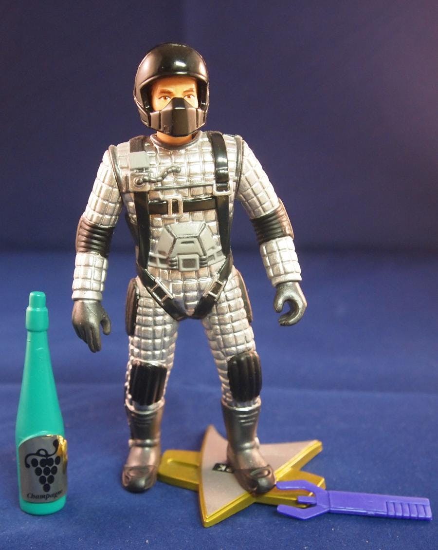 Another important note is that one of the figures in the Generations line was “Captain James T. Kirk in Space Suit.” Although filmed, the original beginning of the film of Kirk conducting a dangerous orbital skydiving stunt as Scotty and Chekov wait for him down below on Earth) was edited out entirely (you can find it on YouTube). Interestingly, this predates Kirk’s orbital skydive in J.J. Abrams’ Star Trek (2009). This figure provided fans a look at what Kirk’s costume would have looked like (although more blue in tone in the film), and included an impossibly large Champagne bottle as one its accessories because Kirk’s journey to Earth was to be intercut with a bottle sailing towards the U.S.S. Enterprise 1701 B’s christening. Kirk’s costume would later be adapted to B’Elanna Torres for the Voyager episode “Extreme Risk.”