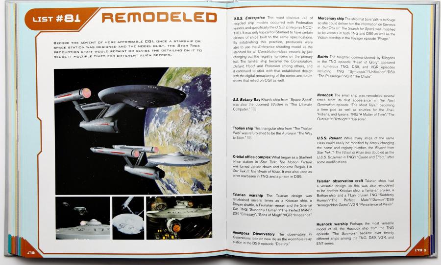 Now that I had an overview, I’d review the compiled list and begin writing. Much of it I could rattle off, but I still needed to do a fair amount of research. Luckily, I still know people who worked on the shows and films that I could call for info, as well as a number of licensed works. From the Okudas’ updated Star Trek Encyclopedia — which was also produced by my publisher — to the TNG Technical Manual and individual show companion books, a wealth of information existed to help in researching lists. And, of course, my editor, who started out as a Paramount Studios tour guide and also wrote several Trek reference books, was a useful resource as well.