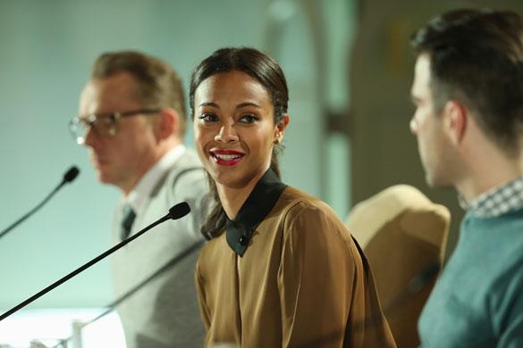So, they met your expectations in terms of Uhura?SALDANA: Yes, they did, and I know the rest of the actors felt the same way. To feel that energy, to know that everybody felt seen and heard by your director, your group of writers, your peers, you feel very integrated into the teamwork, into the collaboration of doing a movie like this.A lot of the footage fans have seen so far has been of the action variety. What sense did you get from J.J. Abrams that it was as important to him to hit the dramatic beats as well as the action beats?SALDANA: For J.J., it’s the acting and characterizations that matter most and sometimes it’s the only thing that matters. It’s like he’s expecting you to have all the action together with the stunt team. Obviously, once he sees it, he decides if it’ll aesthetically look good and if it matches the personality that your role possesses. If it doesn’t, then he’ll intervene. But, for J.J., it’s about the story and the characters and their lives. That’s what matters the most, and I love that. Again, we know you can only say so much, but how does Uhura figure into the emotional core of the story?SALDANA: The more and more the danger and the stress level rises and the story unfolds, there’s more of an open collaboration among all of the people on the Enterprise. The captain is more open to ideas and suggestions, so Uhura is one of the characters that jumps into it, either by encouraging the captain or by voicing her trepidations.What’s going on between Uhura and Spock (Zachary Quinto) in Star Trek Into Darkness? We’ve heard Quinto say that Spock is misunderstood, especially by Uhura…SALDANA: Yes, Spock is misunderstood because he has explaining to do. Uhura needs a lot of answers to questions that we’ve left hanging with her, with them (as a couple). That’s pretty much what I’m going to say to that.