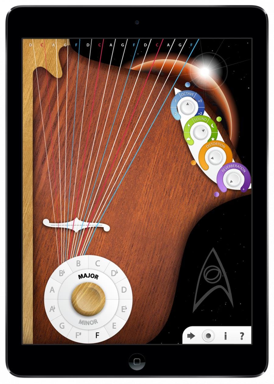 Admit it: ever since you saw Spock (and later Uhura) pluck his Vulcan harp on Star Trek: The Original Series, you’ve wanted to do the logical thing and strum your own harp. Well, now’s your chance. Shiverware and CBS Interactive have teamed up to present a Star Trek Vulcan Harp app for iPad. Available now in the Apple App Store, it’s a replica of Spock’s harp that features a rich, inlaid wood detail and moving starfield background, as well as 15 vibrating strings (each identified to make song-playing easy), 5 instrument sounds (veering from futuristic to classic harp) and a large 6-and-a-half octave range in 5 octave banks. Further, there are custom controls for multi-level distortion and reverberation, one button background arpeggio (sequence chords) and the ability to choose pentatonic scale (five notes per octave).