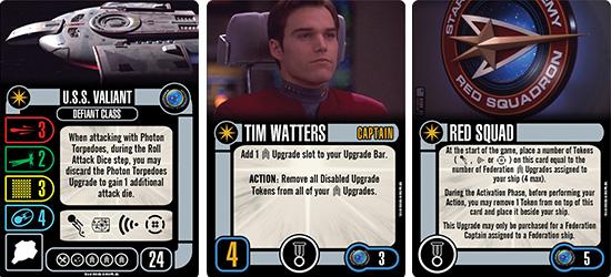 The U.S.S. Valiant has one additional shield compared to the generic version of the ship and gains two Crew Upgrade slots while losing a Weapon Upgrade slot. The special ability for the U.S.S. Valiant allows you to gain one additional attack die when attacking with Photon Torpedoes, if you discard that card during the Roll Attack Dice step. The Captain in this pack is Tim Watters, this card adds one Crew Upgrade slot to your upgrade bar. Also, as an action, you may remove all Disabled Upgrade Tokens from all of your Crew Upgrades. Red Squad is an Elite Talent that allows you to start the game with a number of tokens (Evade, Scan or Battle Stations) on this card equal to the number of Federation Crew Upgrades assigned to your ship (max 4). During the Activation Phase, before performing your Action, you may remove 1 token from this card and place it beside your ship. Desperate times call for desperate measures and here we can see that Captain Tim Watters makes sure the cadets of Red Squad operate at maximum efficiency, while the Elite Talent grants you bonuses for each Federation crew member.