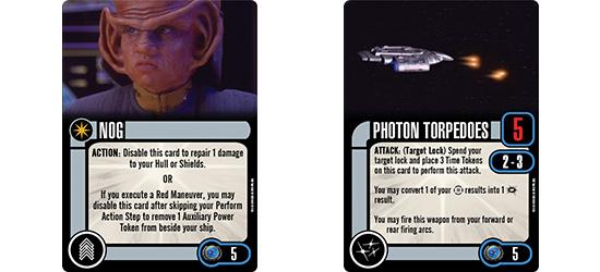 The crew of U.S.S. Valiant all work together to try and restore weapons and functionality to the ship. Riley Aldrin Shepard allows you to take an action to disable this card and perform an additional green maneuver with a speed of 1. Your ship cannot be target locked this round and if there is already a target lock on your ship, you may remove that token. Karen Ferris allows you to disable this card instead of spending a Target Lock when targeting an opposing ship with Photon or Quantum Torpedoes. Dorian Collins may be disabled to immediately repair 1 Shield if your ship suffers damage to its Hull. Nog can be disabled as an action to repair 1 damage to your Hull or Shields, OR if you execute a Red Maneuver you may disable this card to remove 1 Auxiliary Power Token from beside your ship. Photon Torpedoes is the Weapon Upgrade in this pack. This secondary weapon may be fired for 5 attack dice at Range 2-3. You may convert 1 of your Battle Stations results into 1 Critical Hit result.