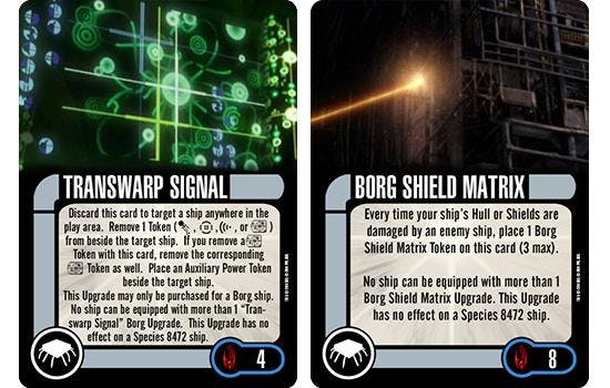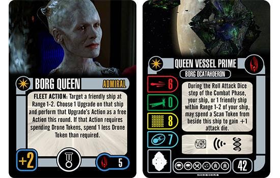StarTrek.com has the final First Look at NECA/WizKids' upcoming Star Trek: Attack Wing's Wave 8 releases, and today we preview the Queen Vessel Prime, out in October. Like most other Borg ships, the Borg Octahedron has high attack values and is extremely durable. The special ability allows the use of a Scan token to bump attack potential even higher for the ship or another friendly ship within range 1-2. When using the Tactical Drone as captain, players have the ability to diminish an opponent’s defensive rolls. Alternately, the Borg Queen can have her influence felt throughout the fleet by activating upgrades on friendly ships when she is used as a Captain or as the fleet’s Admiral.